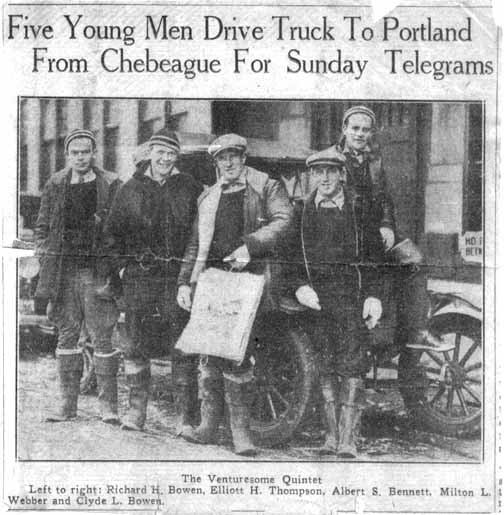 Coaxing the motor of a dilapidated light truck into functioning, the men, Milton L. Webber, 30, the driver, Elliot H. Thompson, 21, Richard H. Bowen, 21, Clyde L. Bowen, 18 , and Albert S. Bennett, took off from the north side of the Island, set a course in back of Cousins Island and then followed the main shore to Town Landing. Here they pushed and tugged the truck through deep snows, managed to reach the main highway and a short time later arrived with a flourish in front of the Press Herald Building. Old timers like to recall that in the Winter of 1917 and during previous cold snaps that horses and sleds were frequent sights on ice-locked Casco Bay. But the trip of the your adventurers undoubtedly marked the first time that a truck has been driven from Great Chebeague Island to Portland and they also probably established a time record between the two points, covering the approximately 14 miles in three-quarters of an hour.