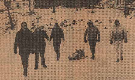 ISLAND TO ISLAND ON FOOT - Five Chebeague Island residents leave Cousins Island Wednesday on a trek across the ice-locked channel between the two islands, the first time in eight years foot travel between the islands has been possible. They recalled other such trips in 1957 and 1934. The trip, slightyly more than a mile, took the group 30 minutes. They draw a toboggan carrying gasoline for mail deliveries on Chebeague. From left are Charles Kuntz, caretaker at Ballard Estates; Mark Kuntz, his nephew and a student at Southern Maine Vocational Technical Institute; James Kuntz, Charles' brother; Emery Dought, Chebeagu postman, and Calvin Doughty, his brother, a clam fisherman.