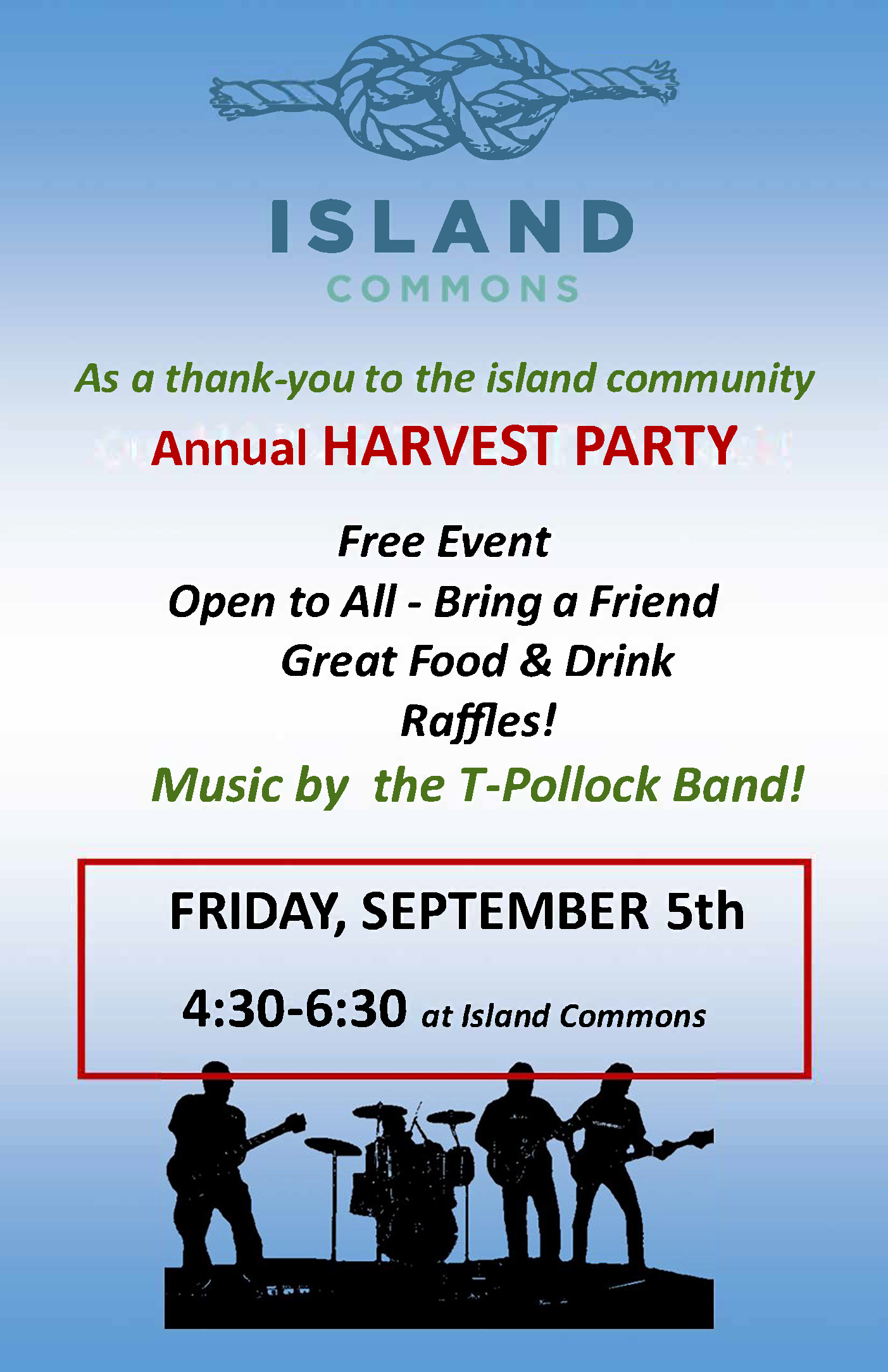 September 1, 2025 - NOTICE: Commons Annual HARVEST PARTY This Friday, September 5th from 4:30 - 6:30 at the Island Commons - Great Food & Drink and Raffles! Music by the T-Pollock Band!! See Flyer.