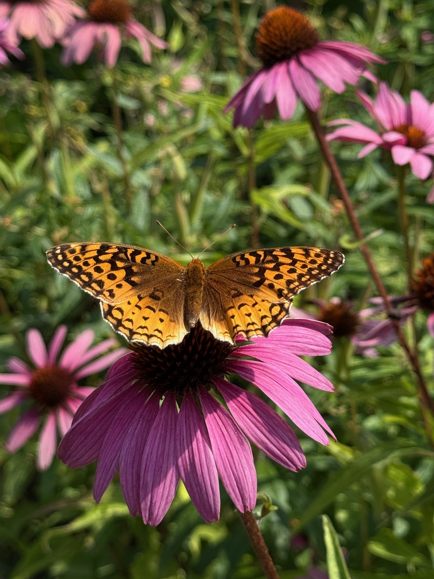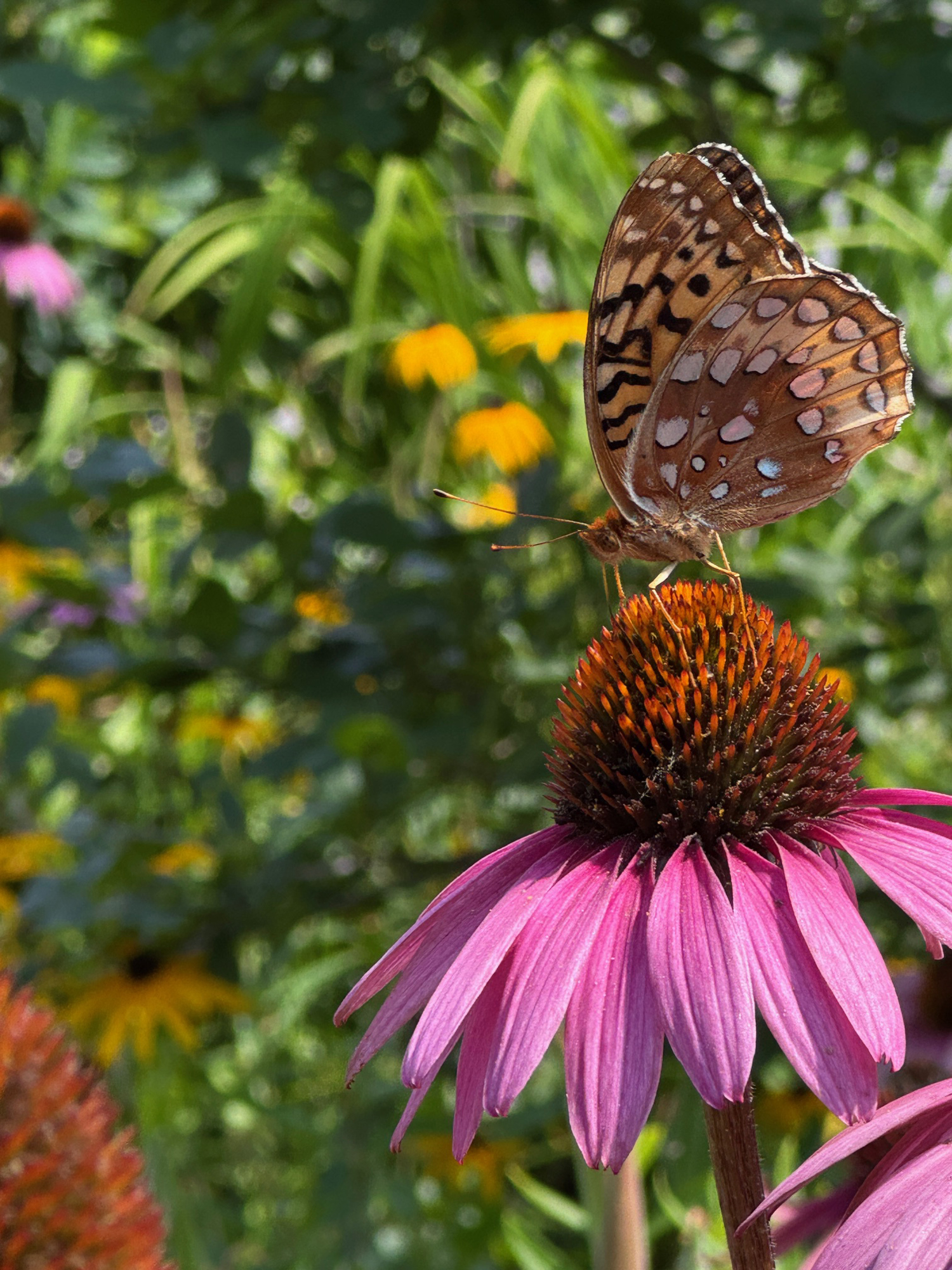 August 14, 2025 - photo - of a fritillary outside the Library by Sara Shettleworth! Click here for another view.