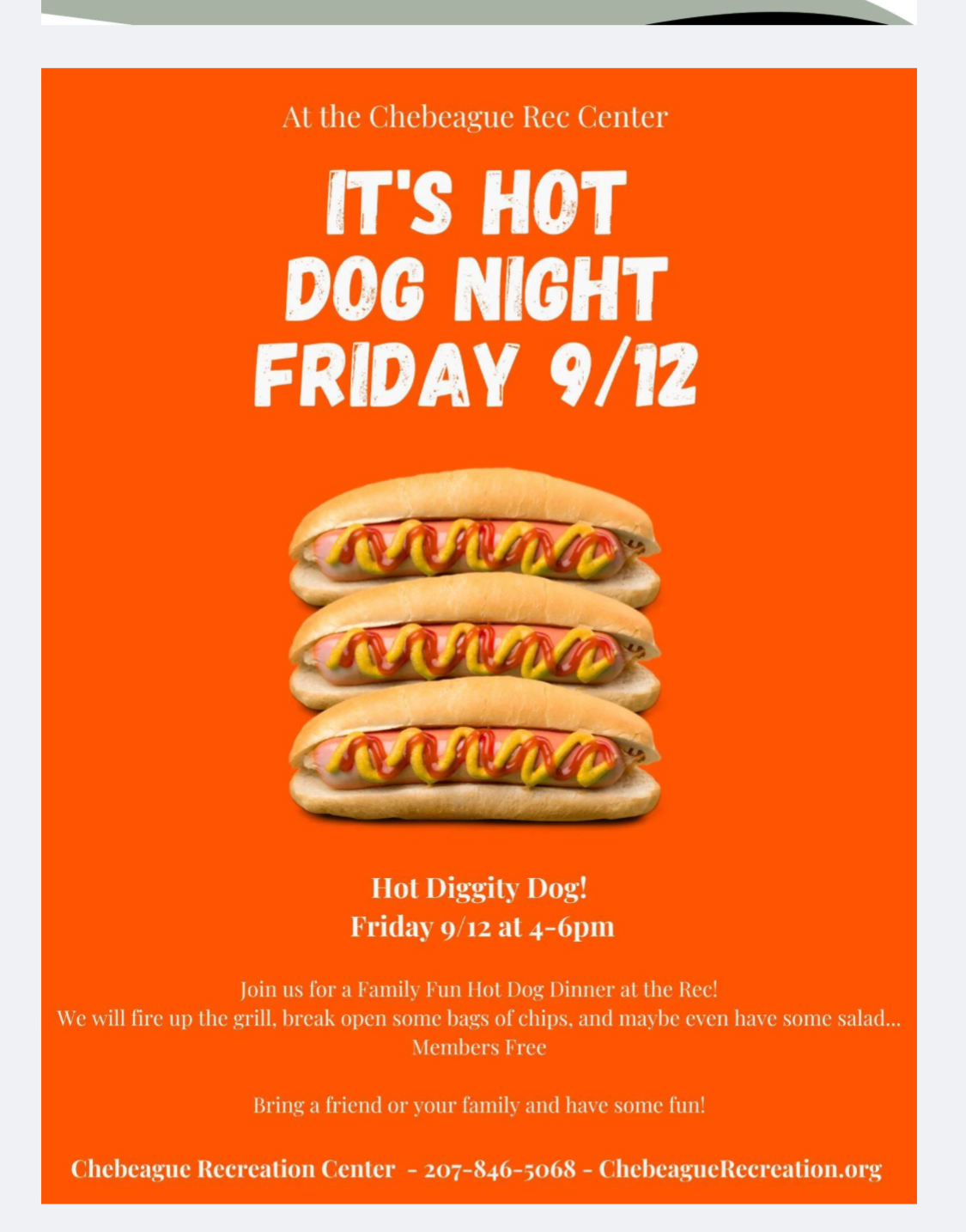 September 9, 2025 - This Friday, September 12th from 4 to 6 is Hot Diggity Dog Day at the Rec!! Meet the Island Fellow - they will be firing up the grill for hot dogs, chips and salad - bring a friend and family and have some fun!