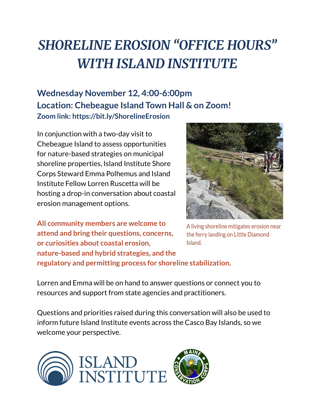November 11, 2025 - A message from Lorren Ruscetta (Our Island Fellow): Do you think about the future of Chebeague's coastline and how it may change as a result of erosion? Do you have questions or ideas about the response to shoreline erosion at your property or on the island generally? A reminder that myself and Island Institute Shore Corps Steward Emma Polhemus will be hosting a Shoreline Erosion Office Hours at the Chebeague Hall (and on Zoom, link is below) this Wednesday the 12th from 4:00-6:00pm!