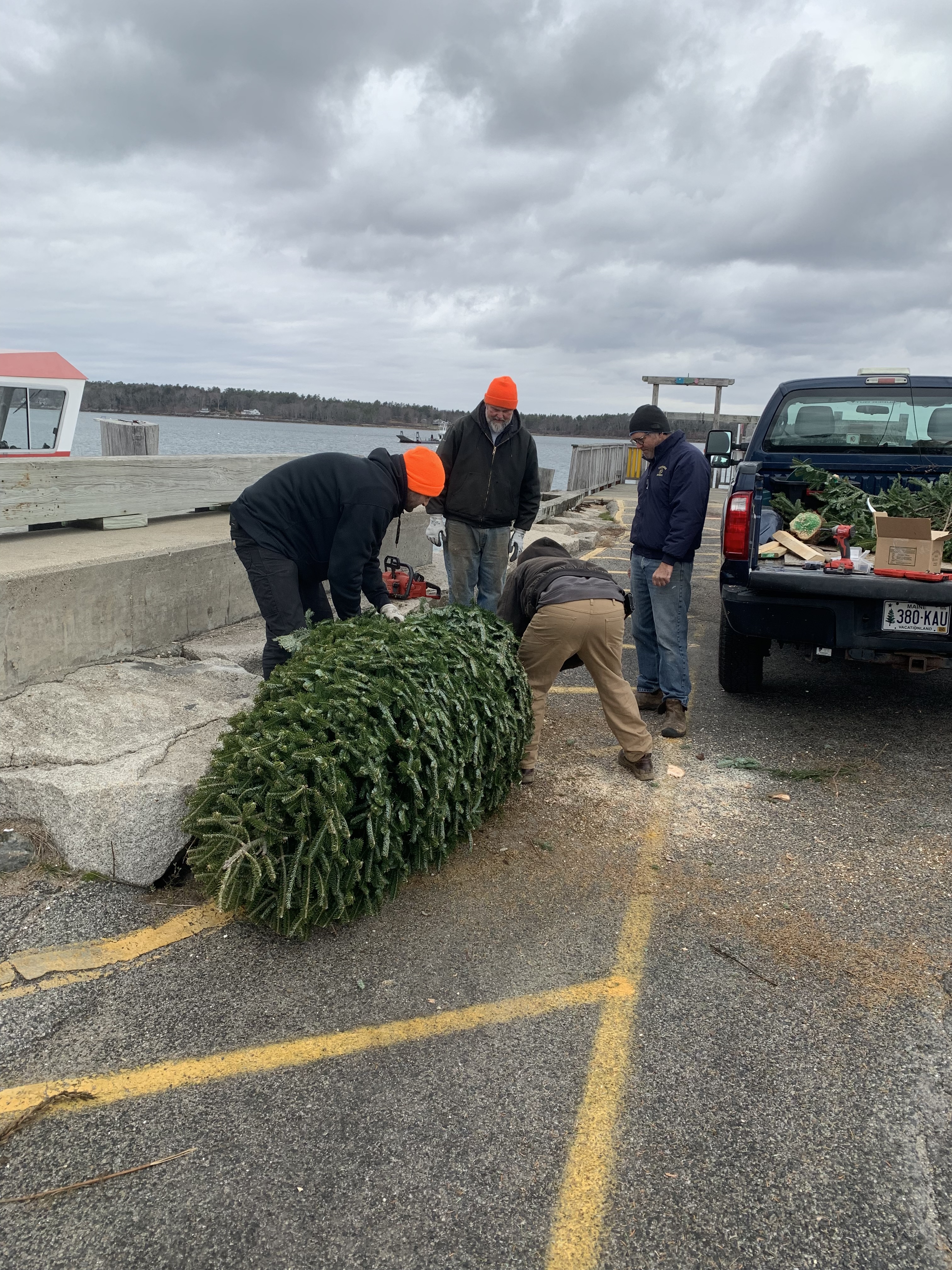December 1, 2025 - photo - by Doug Ross of the fireman setting up the trees at the wharfs! Thank you so much. Click here for another of them at the Stone Wharf.