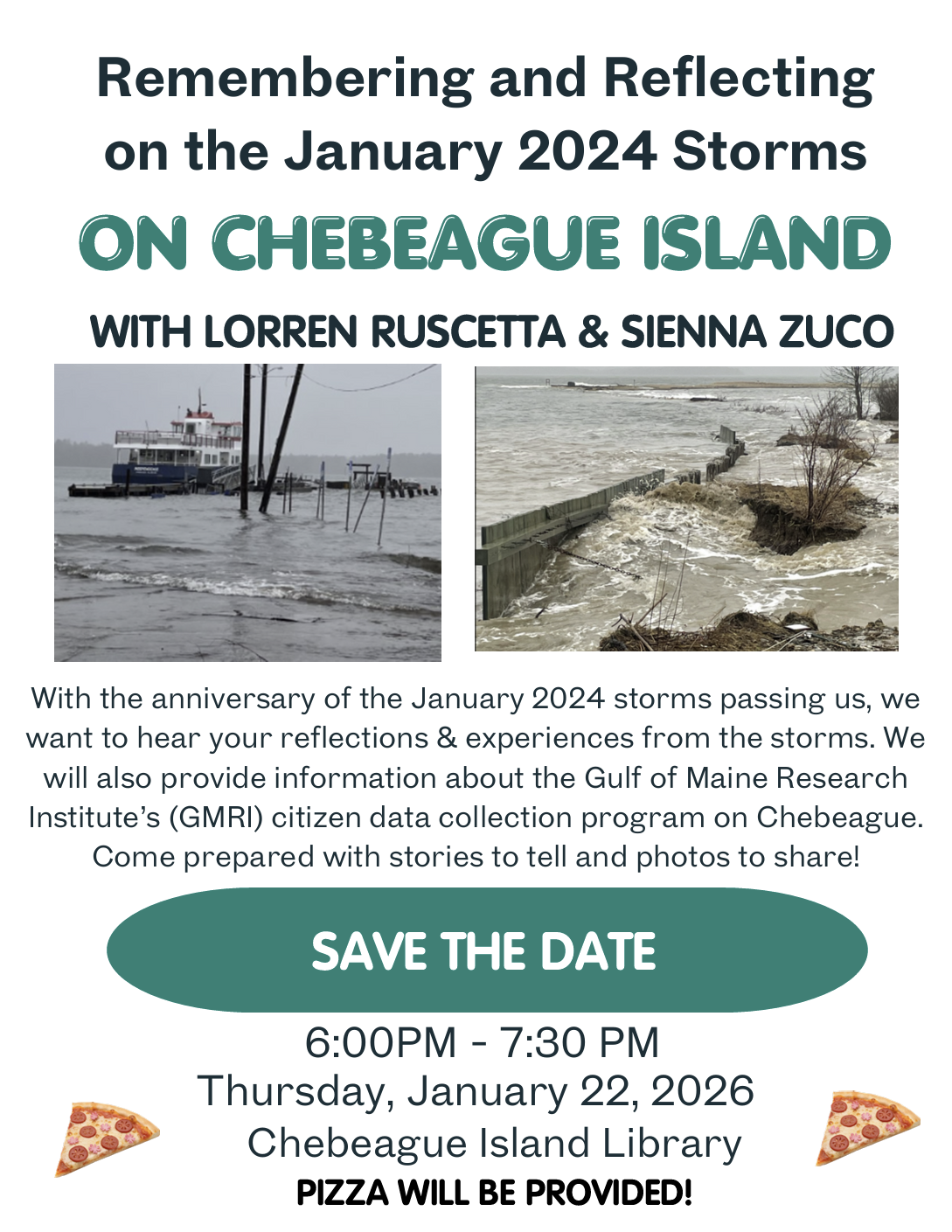 A message from Lorren Ruscetta (Our Island Fellow): Do you think about the future of Chebeague's coastline and how it may change as a result of erosion? Do you have questions or ideas about the response to shoreline erosion at your property or on the island generally? A reminder that myself and Island Institute Shore Corps Steward Emma Polhemus will be hosting a Shoreline Erosion Office Hours at the Chebeague Hall (and on Zoom, link is below) this Wednesday the 12th from 4:00-6:00pm!
