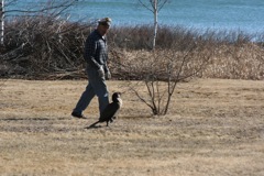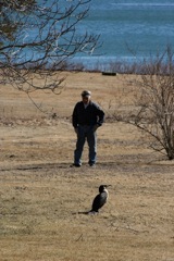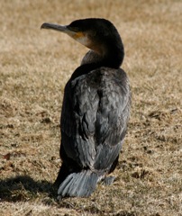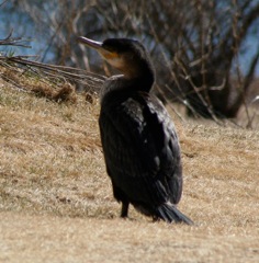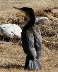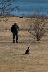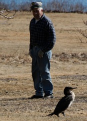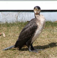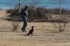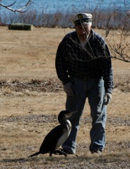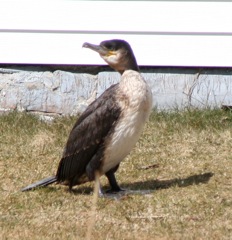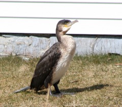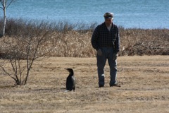 | This juvenile Great Cormorant arrived at Poochie and Priscilla's back door today. He took a nap for a couple of hours between the house and the barn. Priscilla called and I was able to get some great photos of this bird and then he went for a walk with Poochie. We are trying to find out why he is here but we all know that the hospitality at the Ross's, especially if you are wildlife, is unprecedented. |