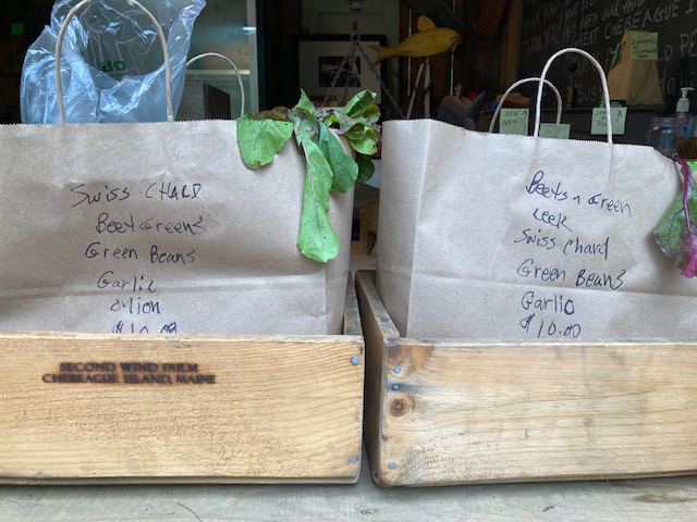 Calling all local food lovers! Second Wind Farm is brimming with fresh veggies. Everything has been prepackaged into paper bags and ready to go. Choose single-bagged items such as potatoes or green beans at various prices, or a large bag of assorted items for $10. Current harvest includes white potatoes, blue potatoes, garlic, onions, leeks, Swiss chard, beet greens, basil, carrots, tomatoes and fresh cut flowers, all grown right here on Chebeague. The farm stand is by honor system and open every day from at least 10 am-2 pm but usually later. Please support your local farm and enjoy fresh local produce!
