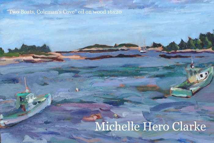 Michelle Hero Clark is a painter from Yarmouth who has lived in Maine since 1991. Most of her artwork is inspired and taken from the local landscape. She primarily paints from life and on location rather than from photographs or memory. She finds this method of working very satisfying as it combines some of her favorite passions in life, which include hiking, being outdoors in nature, and making art. Of her painting process she writes, “Painting outside provides me with a way to respond and record not only my observations of a place but my subjective experience of it as well. In my artwork I am primarily interested in capturing the essence of places or things as I perceive them rather than documenting a photorealistic scene. In painting on site, one is constantly dealing with the potential for rapid change. Light, color and often subject are in a constant state of flux. A cloud can move, changing the shadows and colors, or a dense fog may roll in, obscuring what had been my subject but creating new opportunities to capture something else. Responding to these constant changes gives a sense of urgency and immediacy to the act of painting which I find very challenging and energizing.”