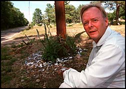 At left: The Rev. Robert Leon of Great Chebeague Island pauses near the new phone pole that replaced the one struck by a car, killing Brooke Olsen. The new pole has been adorned with shells and flowers.