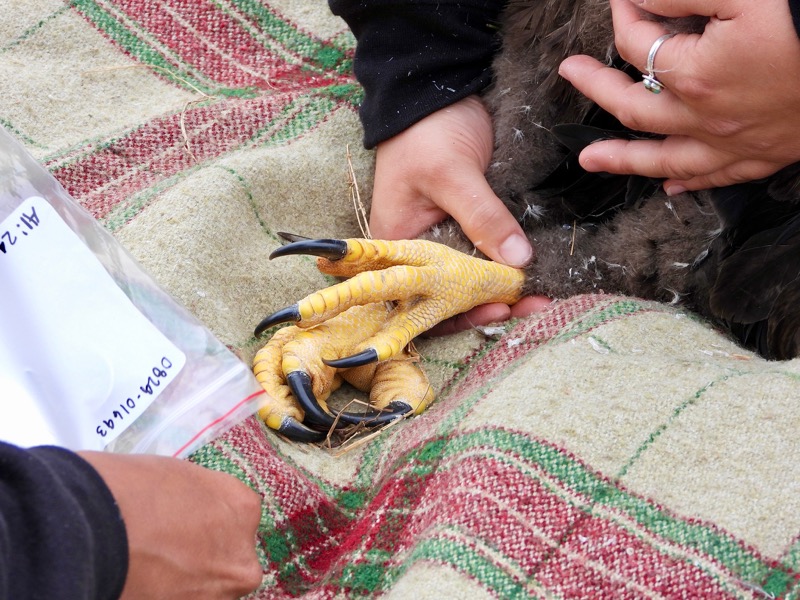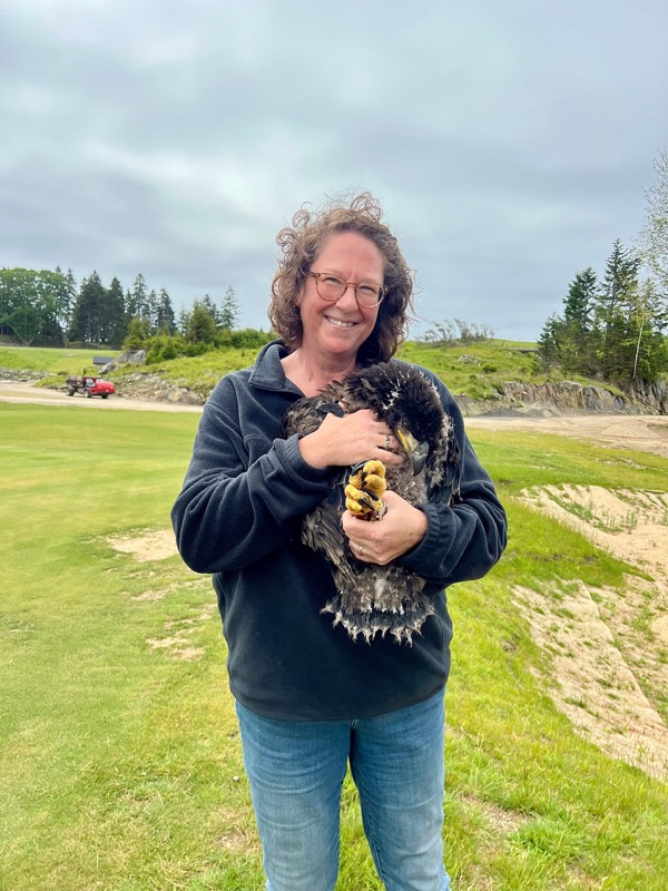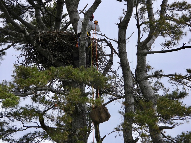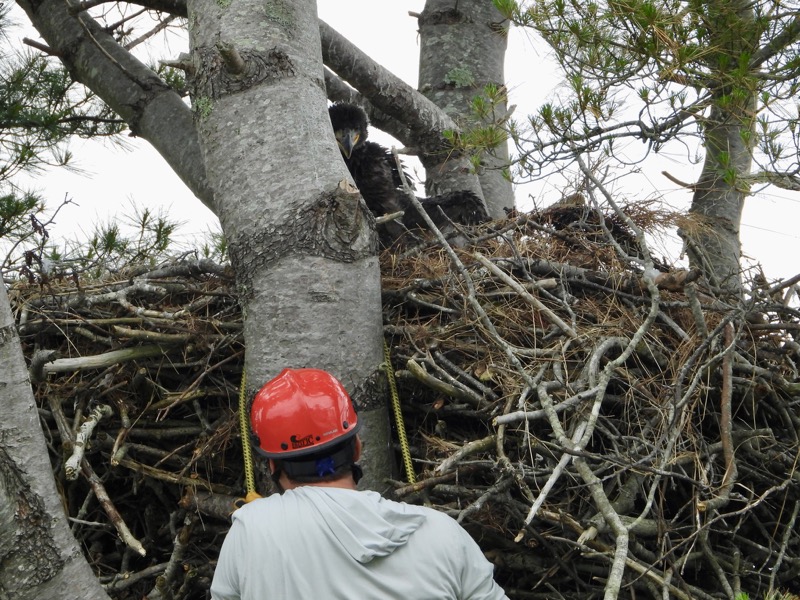 Message from Krista Hayward along with lots of her photos!!!In early June, I was invited to go with the research team from Biodiversity Research Institute to visit Hope Island and collect data & samples, and observe the banding of the Bald Eagle chick. I’d been in touch with them over the spring, reporting observations from Chebeague, which included an estimated hatch date. Upon our arrival on Hope, both Bald Eagle parents were present and though they showed concern with our presence, they were not aggressive. They flew to neighboring trees, made some noise and did some fly-by’s during the observation period to check in. After climbing the tree, Chris DeSorbo, the Director of the Raptor Program, places the eaglet in a canvas bag and gently lowers it to the ground. In addition to banding it (could not determine visually whether a male or female), they took a fecal & blood sample, a feather sample, some measurements along with its weight, and will run tests for lead and mercury contamination. They estimated it to be about 6.5 weeks old, weighing a solid 9 pounds! We had the eaglet out of the nest for about 30 minutes and not long after it was returned, both parents came back. Being at the top of the food chain, eagle research gives a lot of insight as to the health of the local environment. It also helps frame future conservation work and environmental laws. More information can be found on their website, www.briwildlife.org. I will get test results later in the fall-if anyone is interested in seeing them, they can email me. |