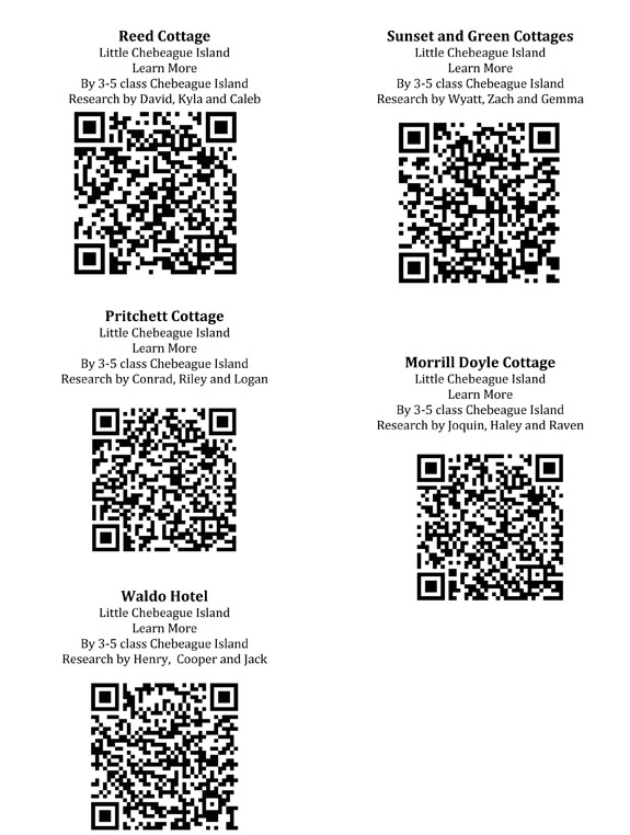 In 2015 the Chebeague Island School Grades 3-5 researched about some of the properties on Little Chebeague and created little videos to share on the island and created QRcodes. You can click on the image and see the short videos.