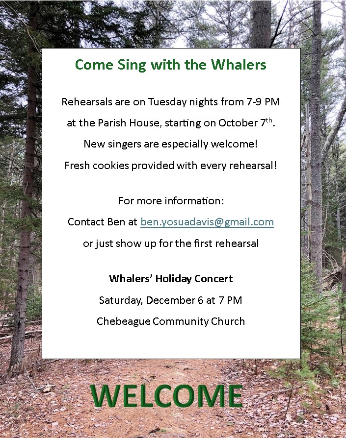 You are invited to come sing with the Whalers. Rehearsals are on Tuesday nights from 7-9 PM at the Parish House starting on October 7th. New singers are especially welcome. Fresh cookies at every rehearsal! For more information, contact Ben at ben.yosuadavis@gmail.com or just show up for the first rehearsal. Also, mark your calendar for the Whalers' Holiday Concert on Saturday, December 6 at 7 PM at the Chebeague Community Church. Click here for flyer.
