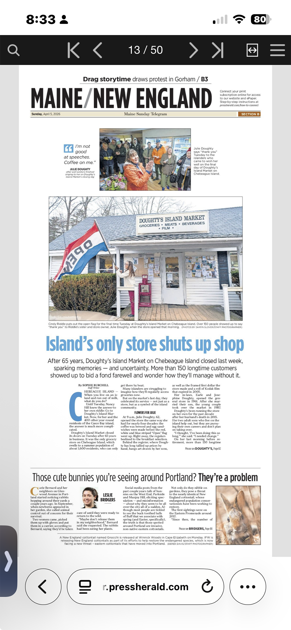 Todays Sunday Portland Press Herald had full page article about the closing of the Island Market. Click here for a photo of page 2 of the article.