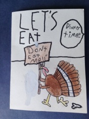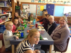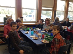 Chebeague School students and teachers share a Thanksgiving meal with the Commons. Laura Summa along with volunteers Laurie Hegarty, Nancy Hill, Celia Whitehead and others put together quite a feast! Some of the students made cards this morning and shared their thoughts and thanks.