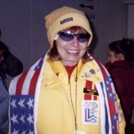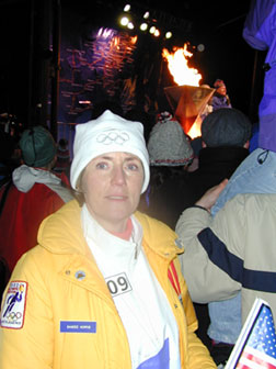 Picture from Lee of Sandee Norris, her 1980 uniform on top of her white 2002 Torchbearer uniform, in the audience on the Lake Placid Olympic Speedskating Oval on Saturday night, Dec. 29, just after two-time 1932 Olympic gold medalist Jack Shea lit the Olympic Flame Cauldron on the stage, which you can see behind her. "Great illustration of the old |